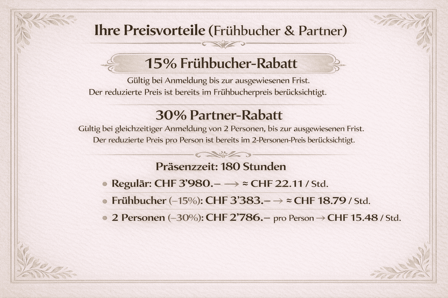 Preis [CHF] Gesamtpreis Schulmedizinische Grundlagen Basic 180 Stunden: 3980.-